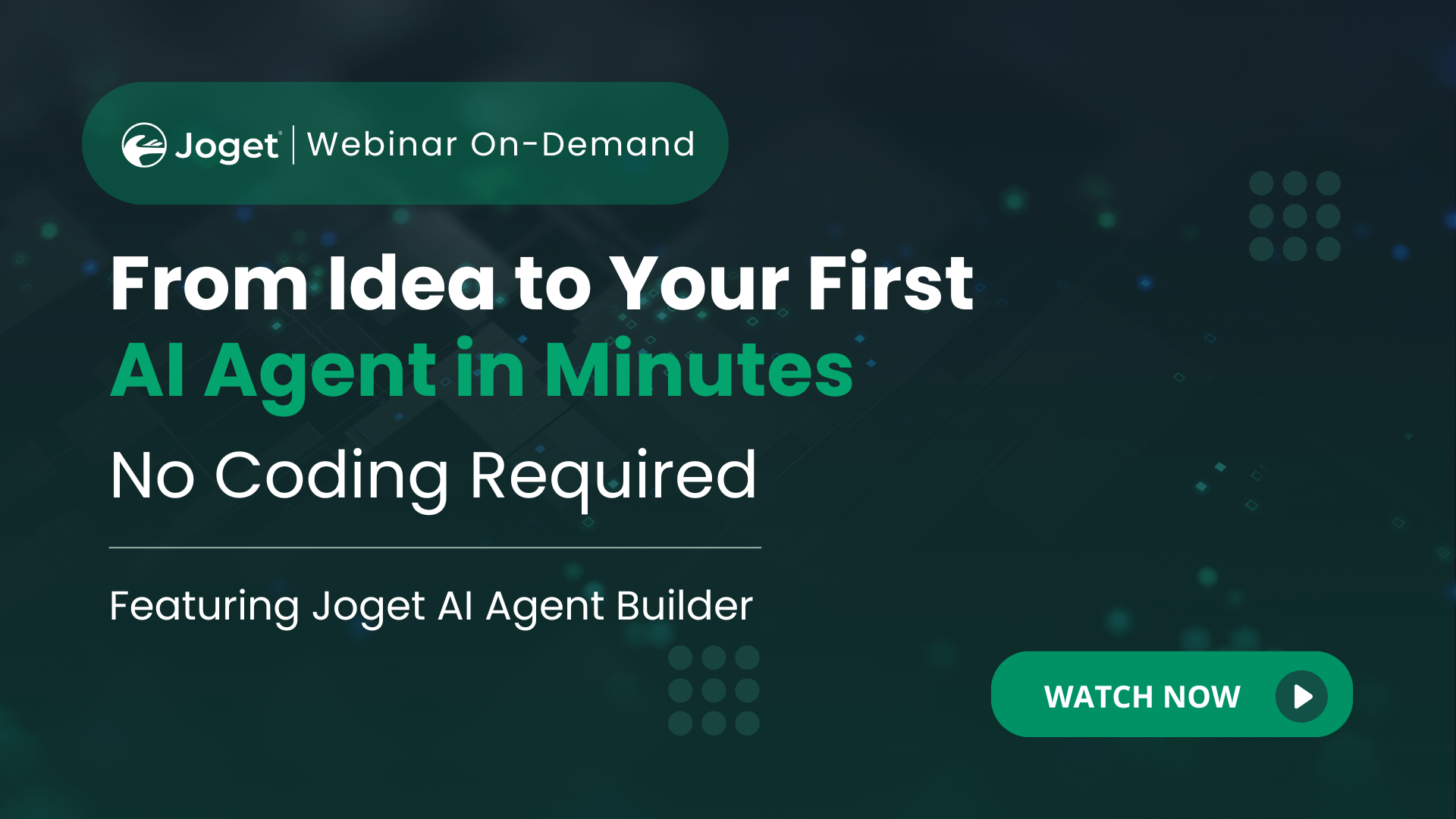 See how AI agents can be built, tested, and deployed in minutes using Joget AI Agent Builder, powered by Joget DX 9 and Joget Intelligence.