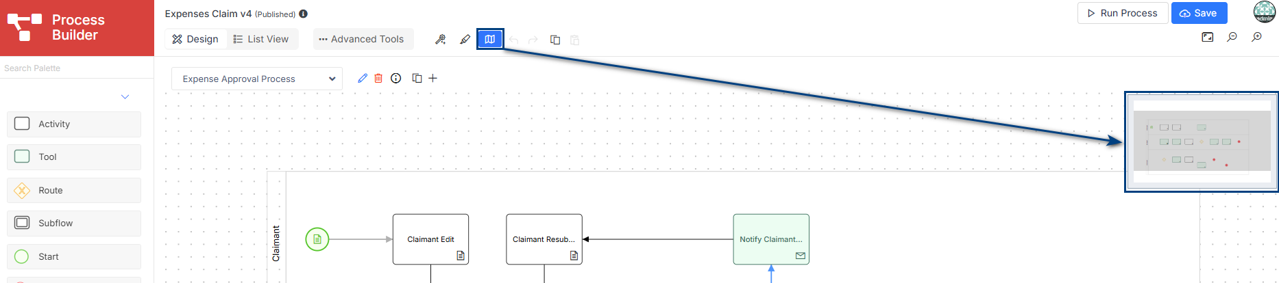 A navigational Mini Map offers a bird’s-eye view of the entire canvas, enabling quick navigation across large or complex diagrams.