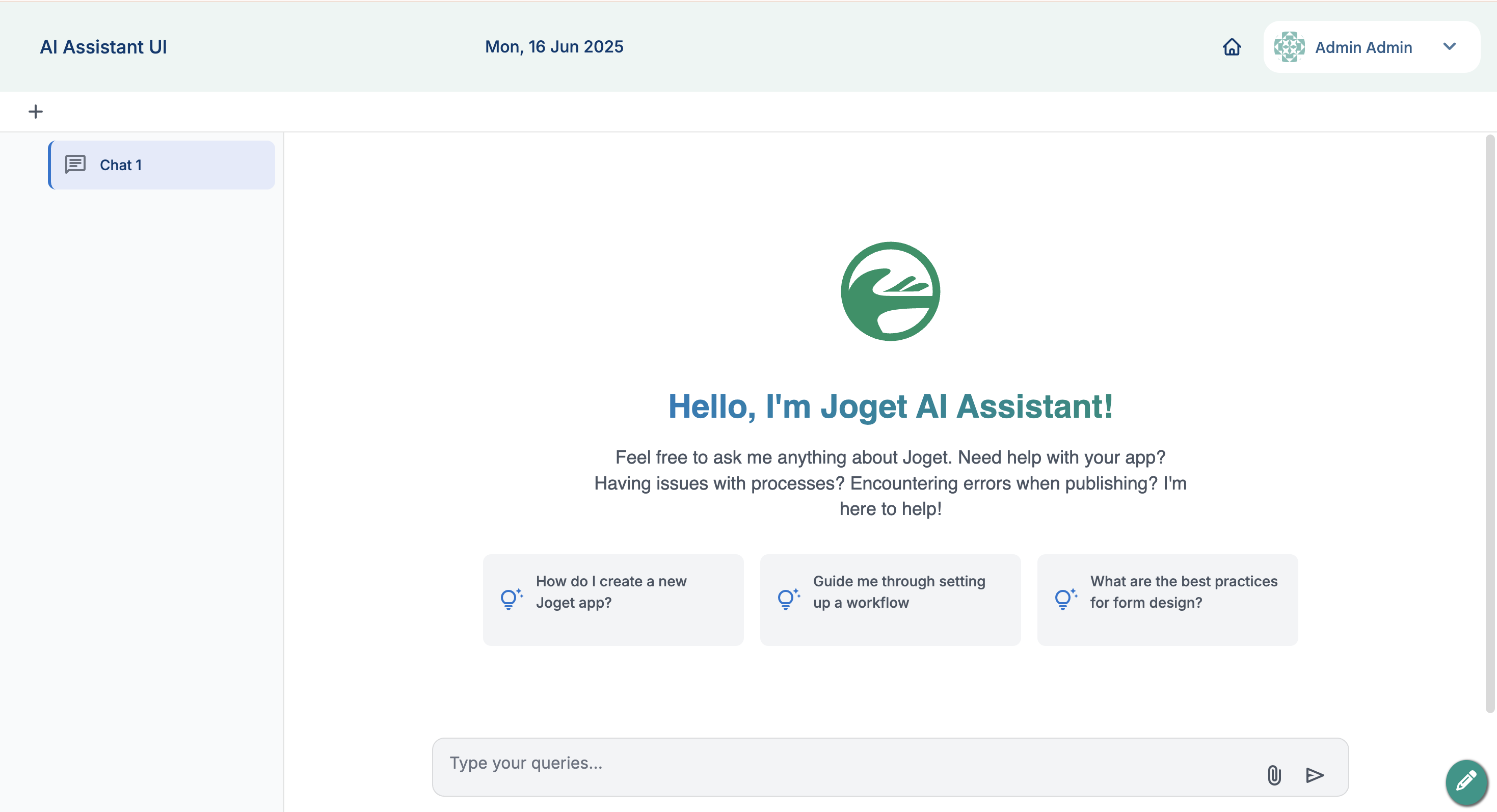A smart assistant embedded within the Joget platform, providing contextual help,  recommendations and data analytics.