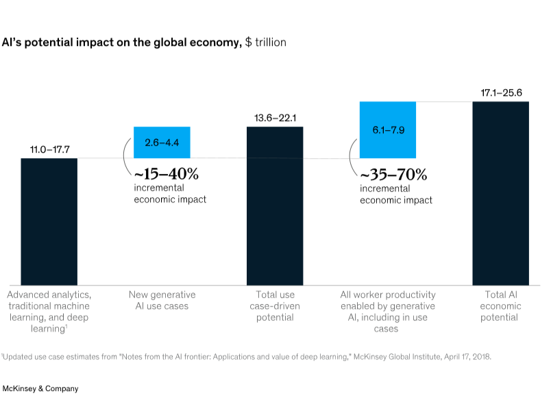 - Economic Impact: McKinsey estimates that generative AI could contribute between $6.1 trillion and $7.9 trillion annually to the global economy by enhancing productivity across various sectors, including software development.